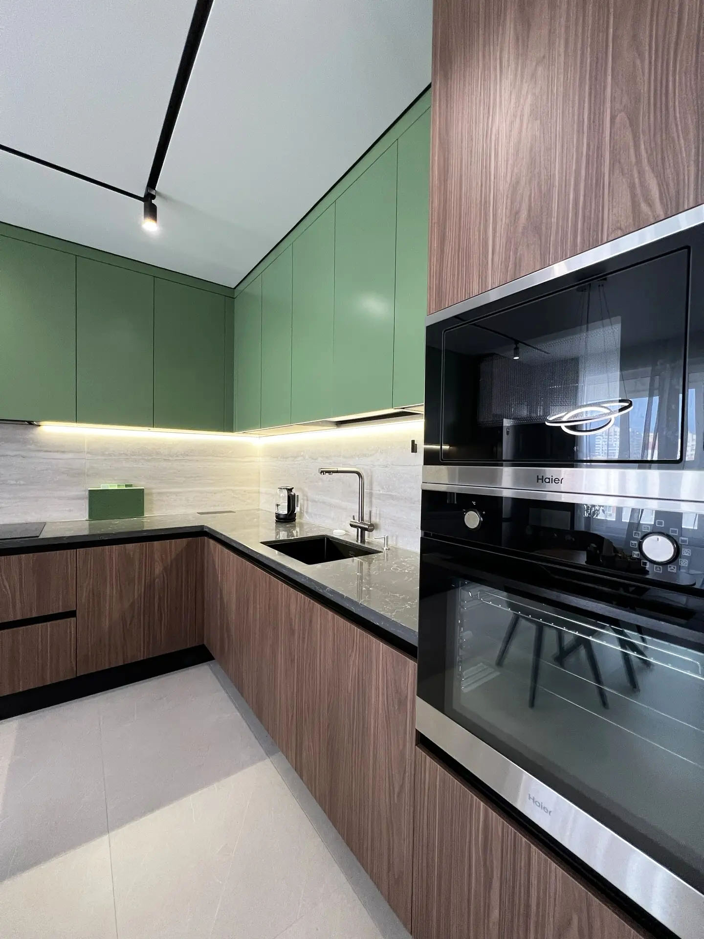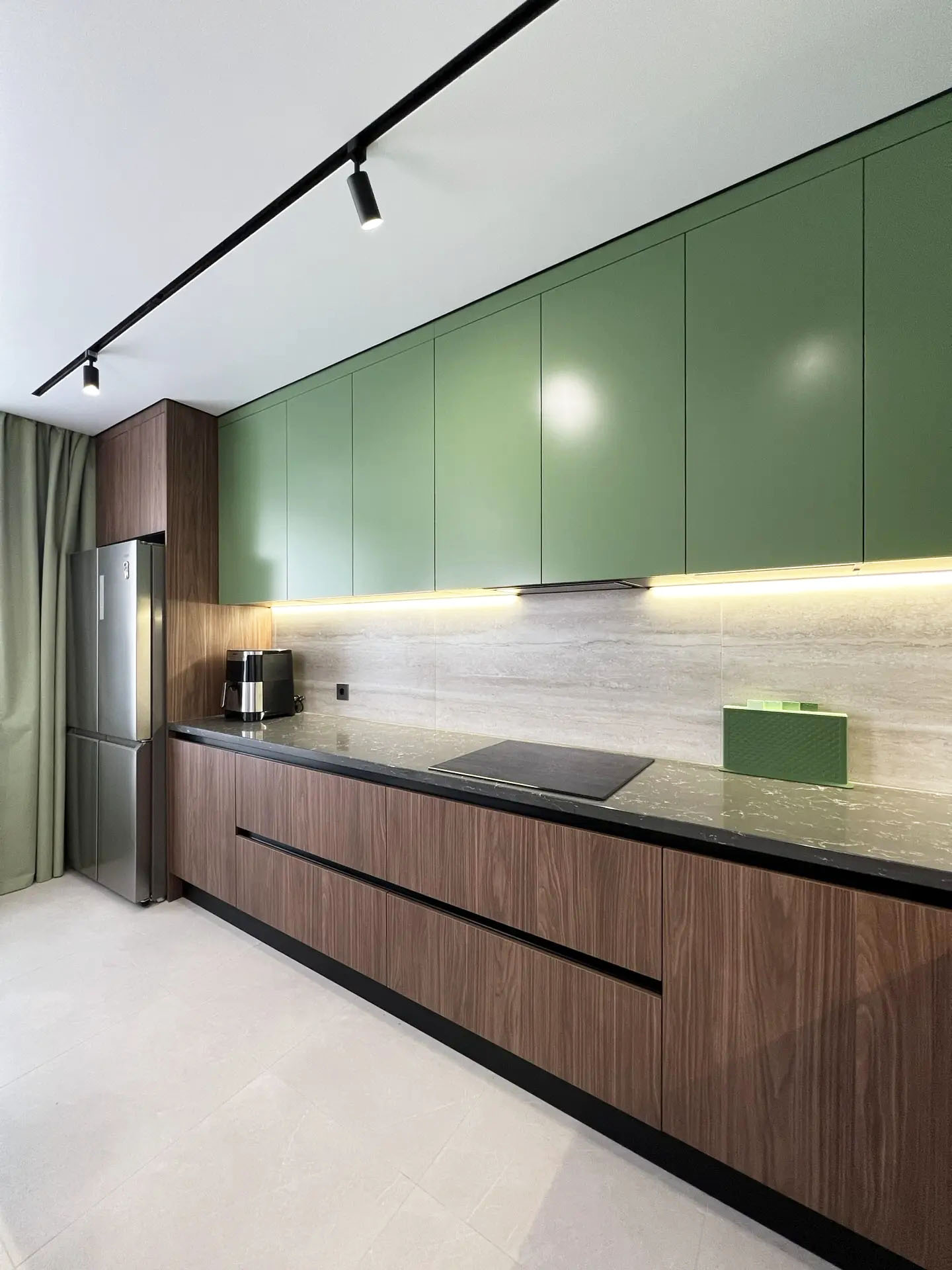 Верхние фасады выполнены в насыщенном зелёном цвете с эмалевым покрытием. Глубокий, но не кричащий оттенок напоминает свежую листву и привносит в пространство ощущение природной гармонии.